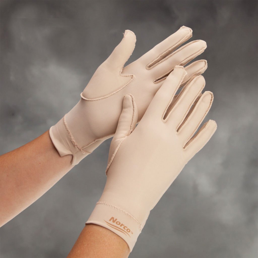 Norco-kompressiokäsineellä luodaan paineen tunnetta käsille, mikä vähentää kipua ja turvotusta käsissä. Mallissa on ulkopuolella olevat saumat, mikä ehkäisee kipukohtiin suuntautuvaa painetta. Halkio ranteessa helpottaa käsineen pukemista. Tuotteen kompressioluokka on 1-2 (15-25mmHg). Kärjet kiinni -malli luo paineen tunteen koko käden ja sormien alueelle.