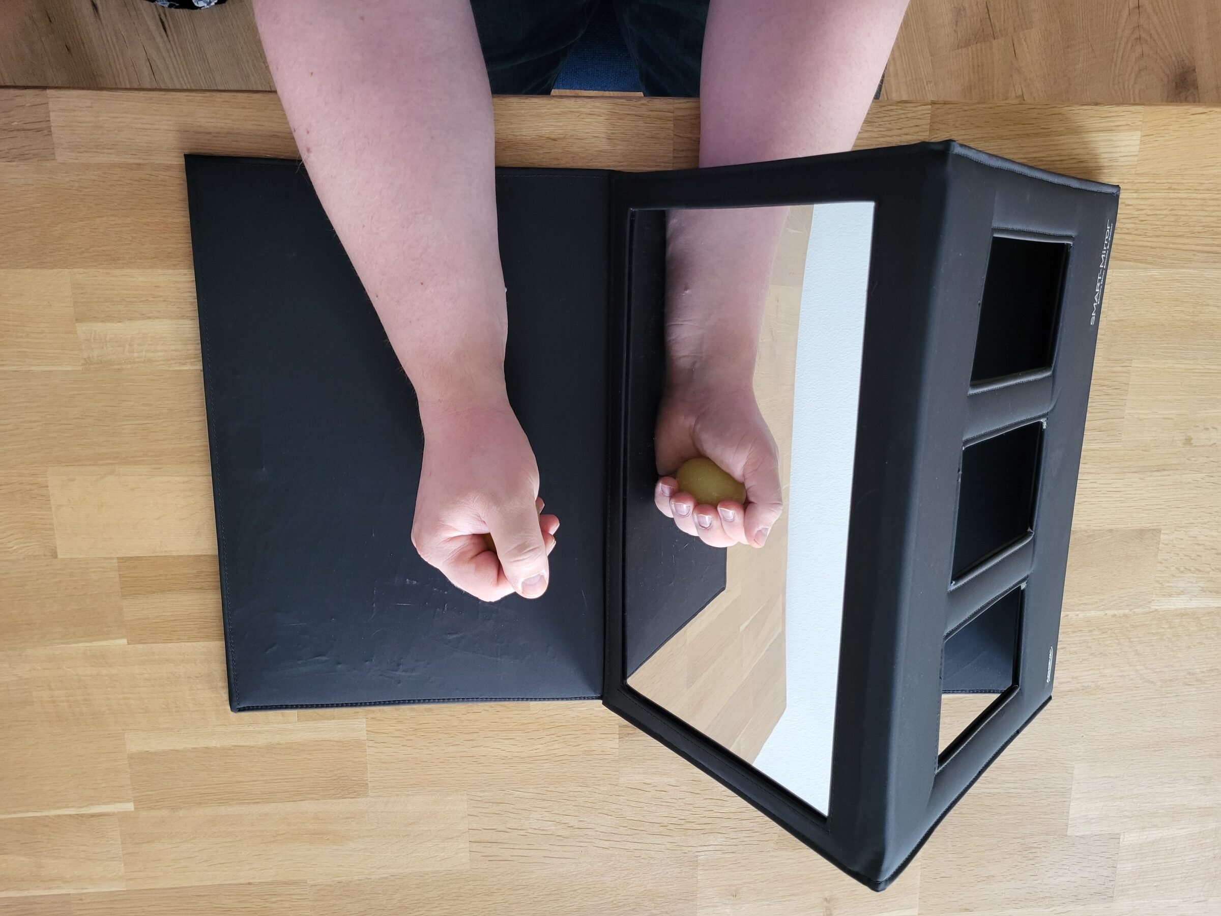 Peili on kätevässä kokoontaitettavassa kansiomaisessa kotelossa, jonka saa helposti taitettua kasaan. Kotelo suojaa peilipintaa esim. säilytyksen aikana. Peilin takana olevassa seinämässä on kolme sivuikkunaa, josta esim. terapeutti voi nähdä harjoitettavan raajan liikkeet.
