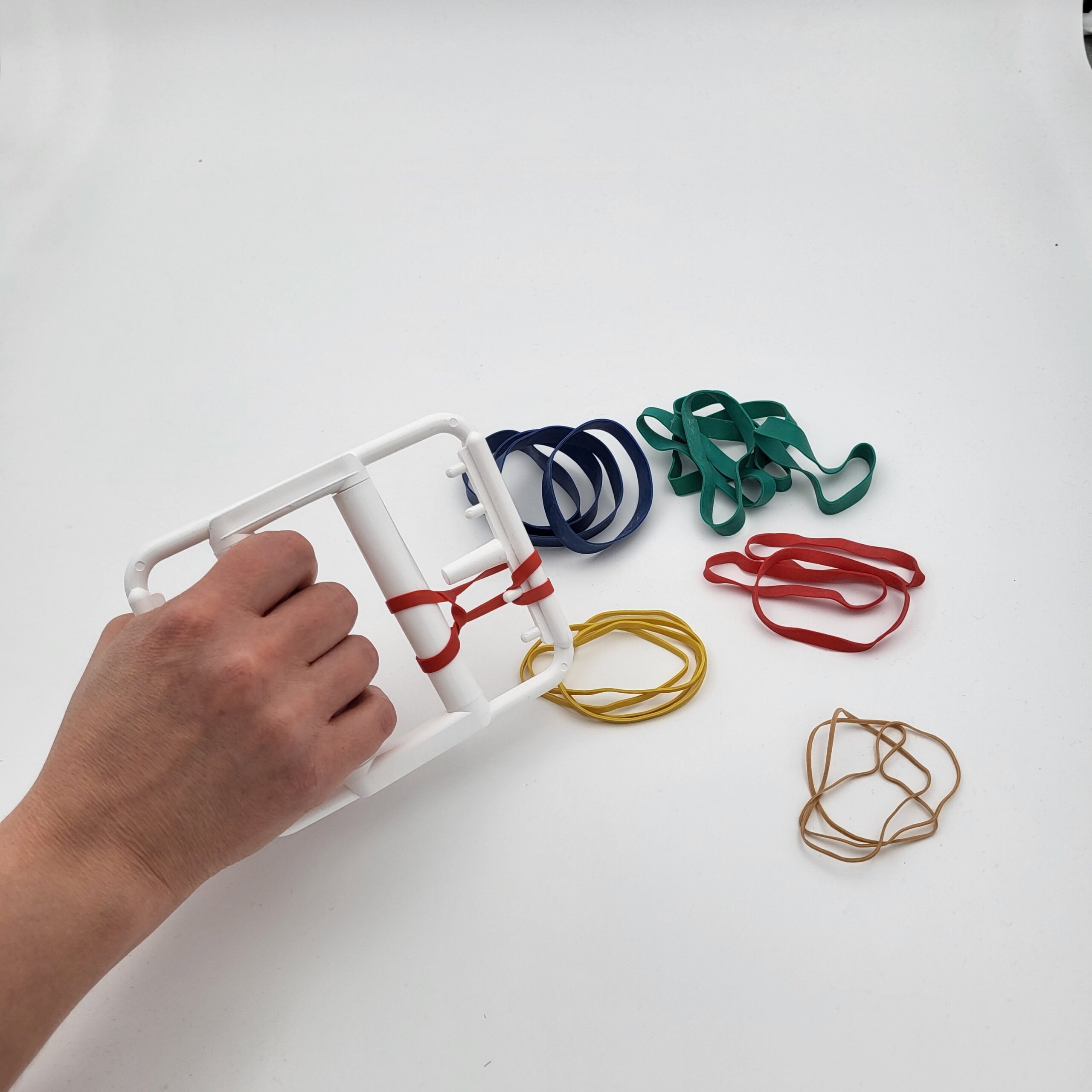 Pakkaus sisältää kehikon, rajoitustapin sekä 25 kuminauhaa