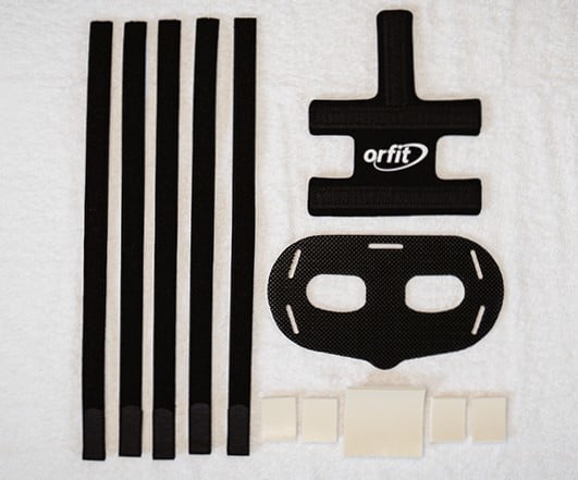 Pakkauksessa yhden koon muovinen maskiaihio, tarranauhat, Orfit-logolla varustettu takakappale ja Luxofoam-palat