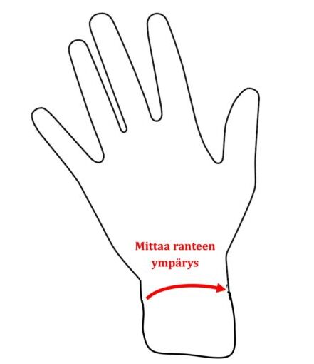 Kolme leveää tarrakiinnikettä käden selkämyksessä kiinnittyvät napakasti. Peukalonauhassa tarranauhasäätö.